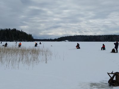 Porvoon Hamarinrannassa pidetyn pilkkikisan osanottajat hajaantuivat ensin eri puolille merenlahtea mutta kokoontuivat pikkuhiljaa lähemmäksi toisiaan, kun tärppejä ei kuulunut. Useimmille meri antoi tällä kertaa tyhjän kalapussin. Voittajat kuitenkin selvisivät: miesten sarjan ja kiertopalkinnon voittajaksi saatiin jälleen Pekka Suckman (istumassa oikealla) ja naisten sarjan vei kiiskisaaliillaan yhdistyksen ulkopuolinen Johanna Nurmiluoto (istumassa keskellä).