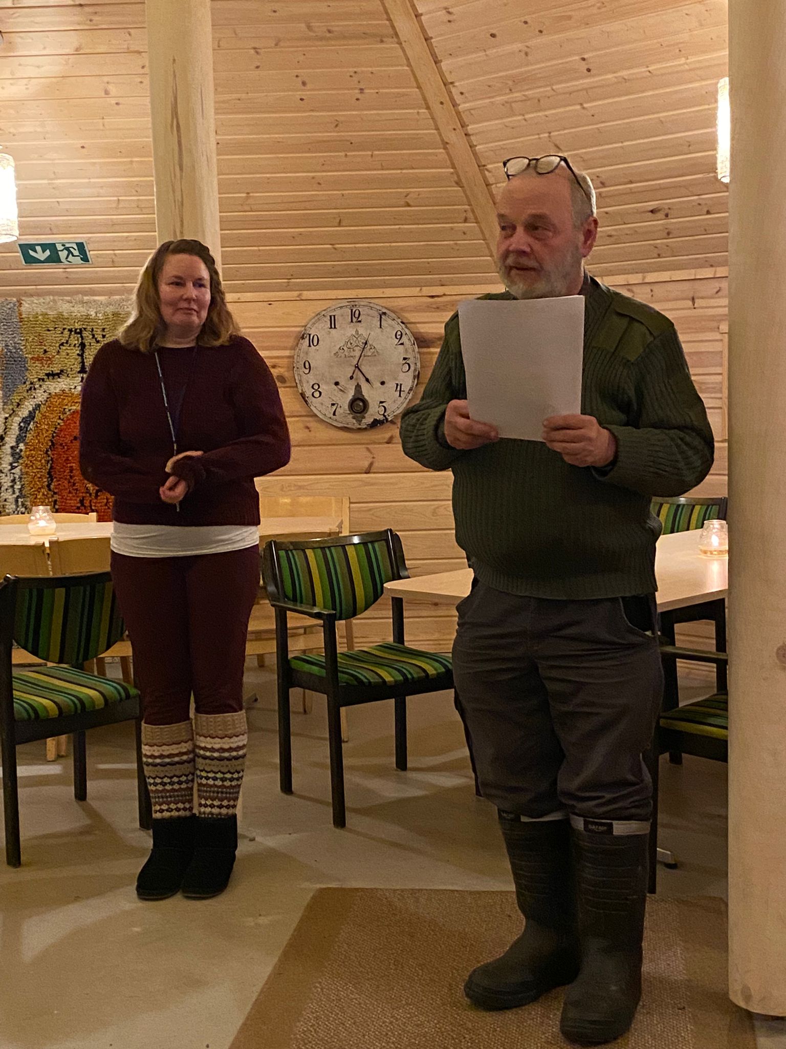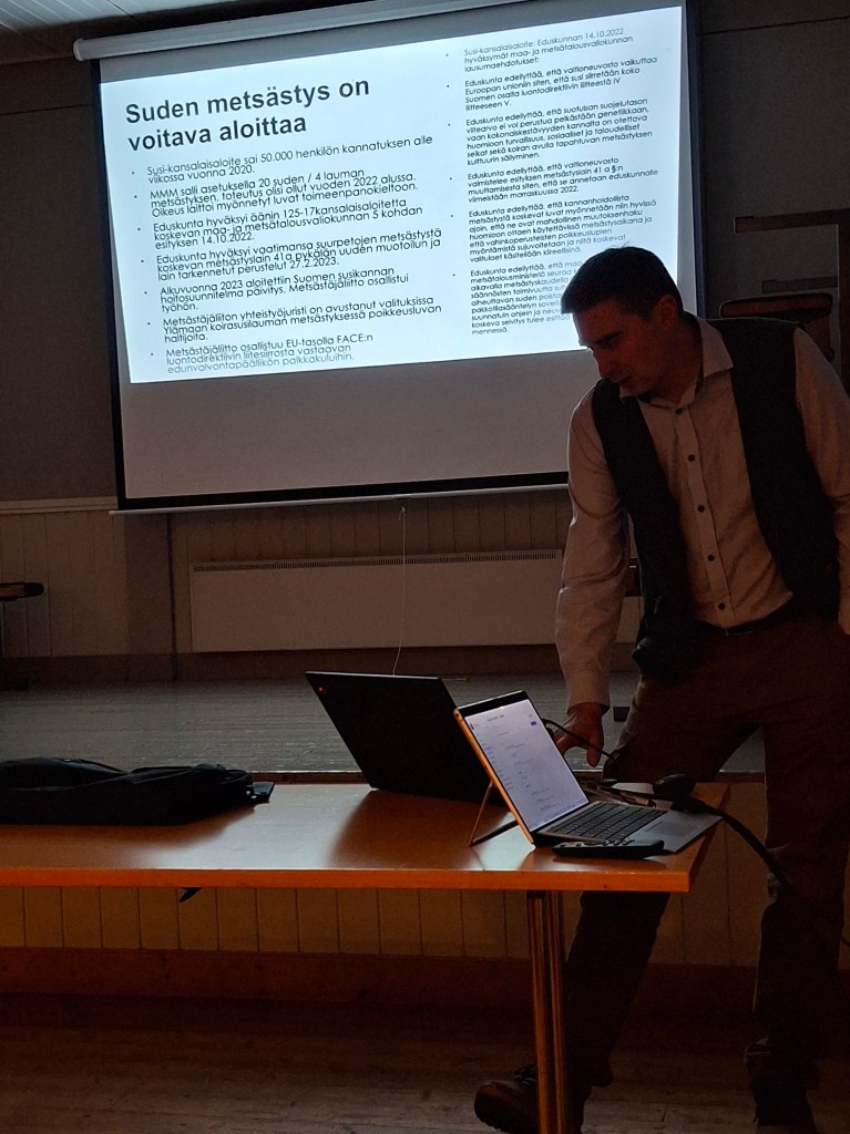 Ruokailun jälkeen Metsästäjäliiton Teemu Simenius piti luennon susitilanteesta.