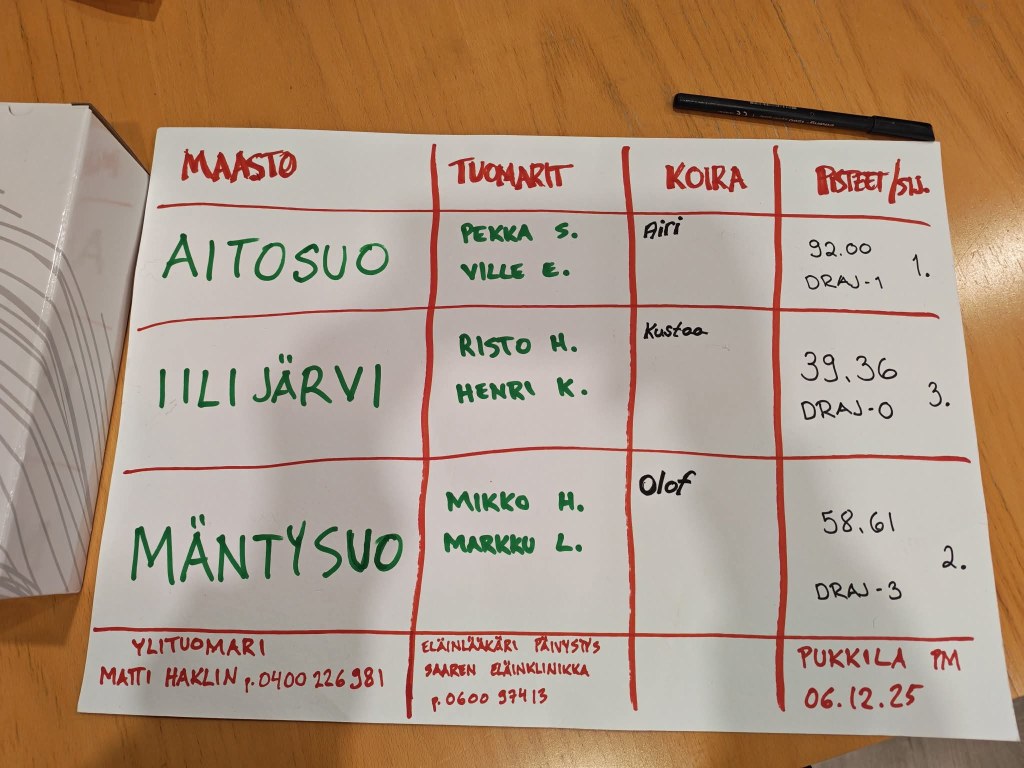 Iitin kokeet tunnetaan hyvästä hengestä, sujuvista järjestelyistä ja mukavasta yhdessäolosta. Päivän ohjelmaan mahtui myös pieniä logistisia haasteita, kun ylituomarin auto olikin alkanut kenkkuloimaan juuri ennen koetta. Tilanne ratkesi kuitenkin nopeasti ja mallikkaasti, mikä kuvastaa hyvin tapahtuman rentoa ja yhteistyöhenkistä ilmapiiriä. Kiitos kaikille osallistujille, tuomareille, harjoittelijoille ja järjestäjille. Yhdessä teimme taas hienon tapahtuman ajokoiraharrastuksen parissa.