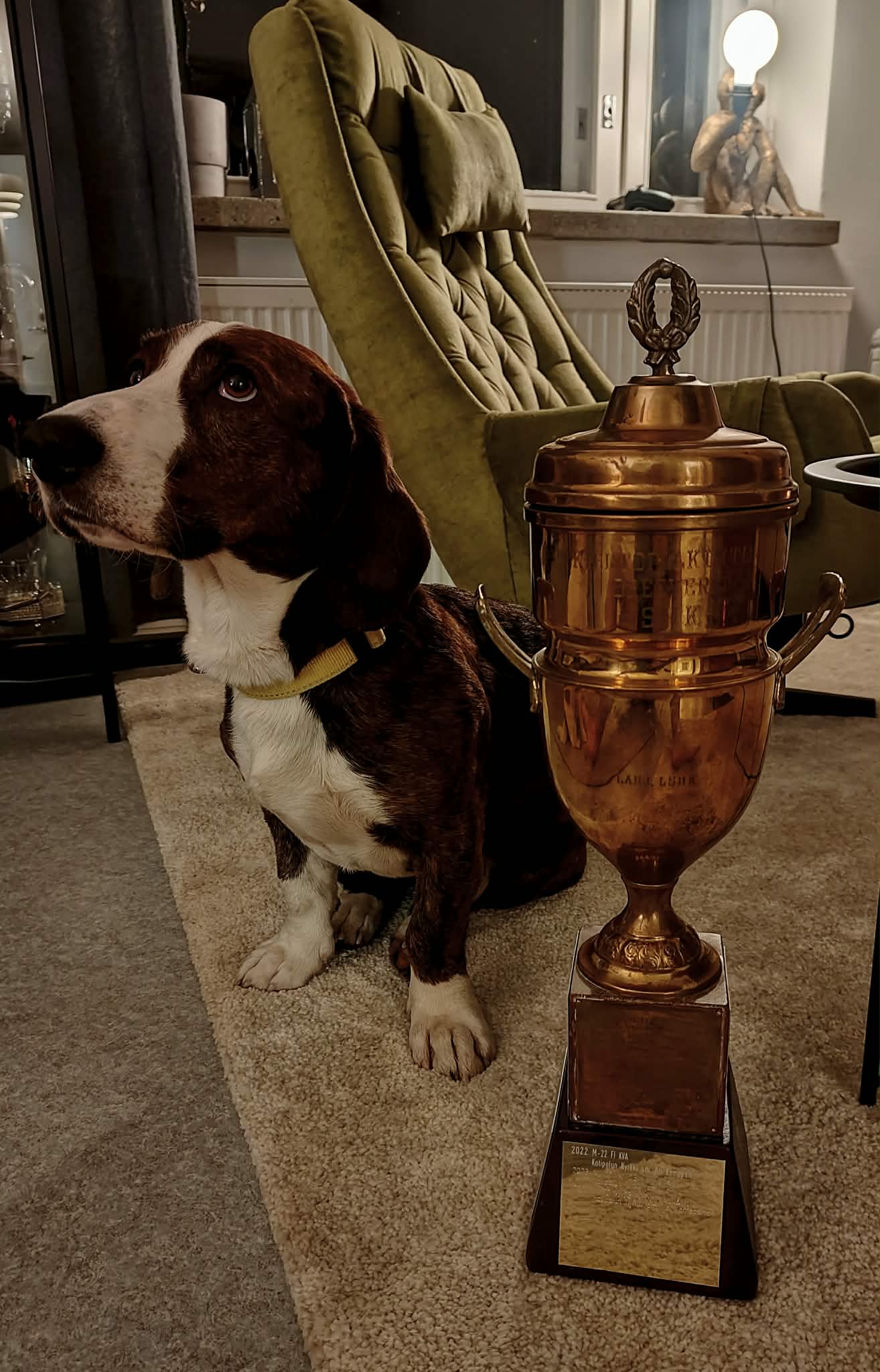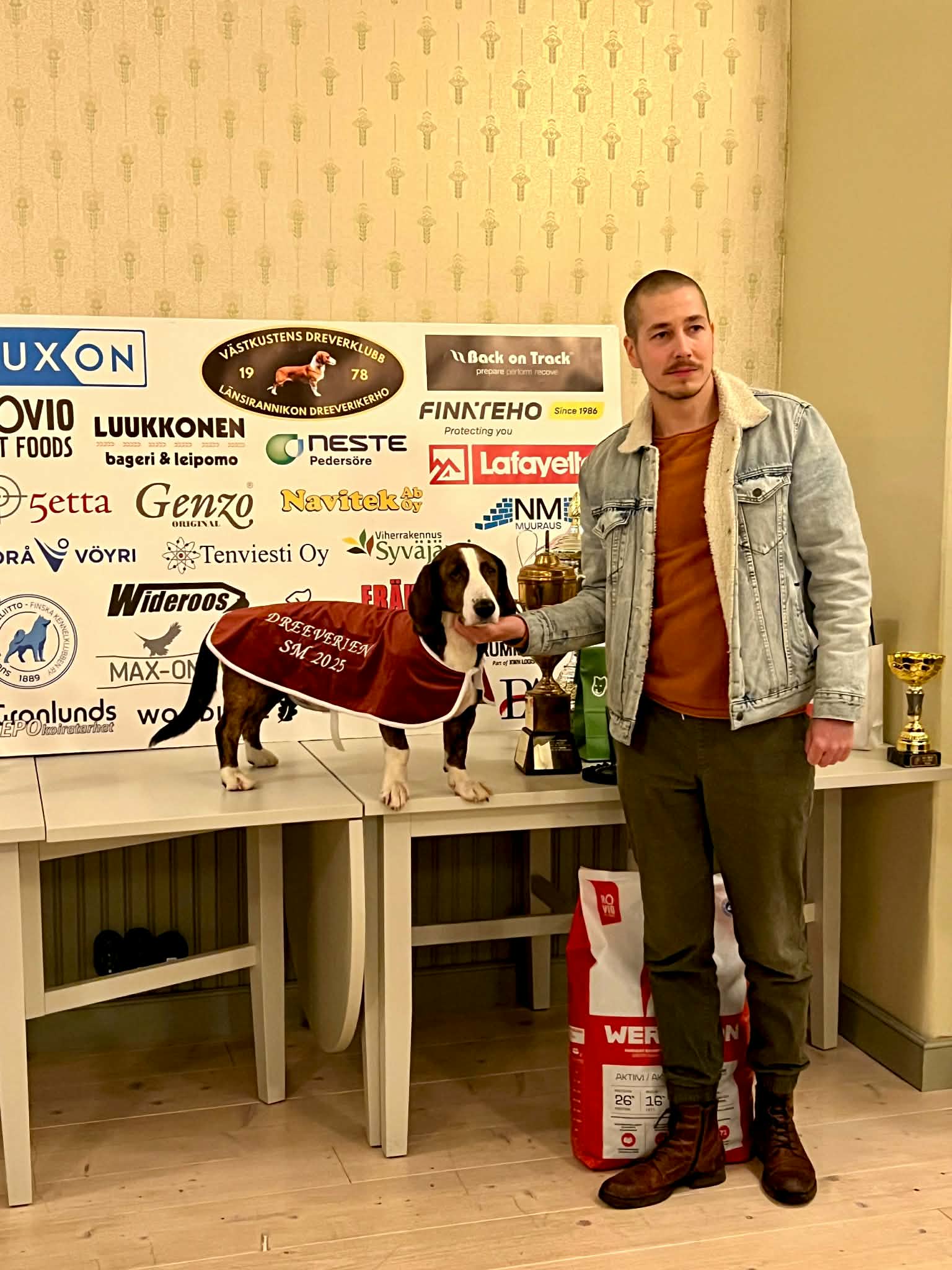 Suomen mestari 2025 – voittaja Rousen Brown Beast omistajansa Henri Myöhäsen kanssa. Kuvassa myös SM kisojen ylituomari Timo Nurmiluoto.